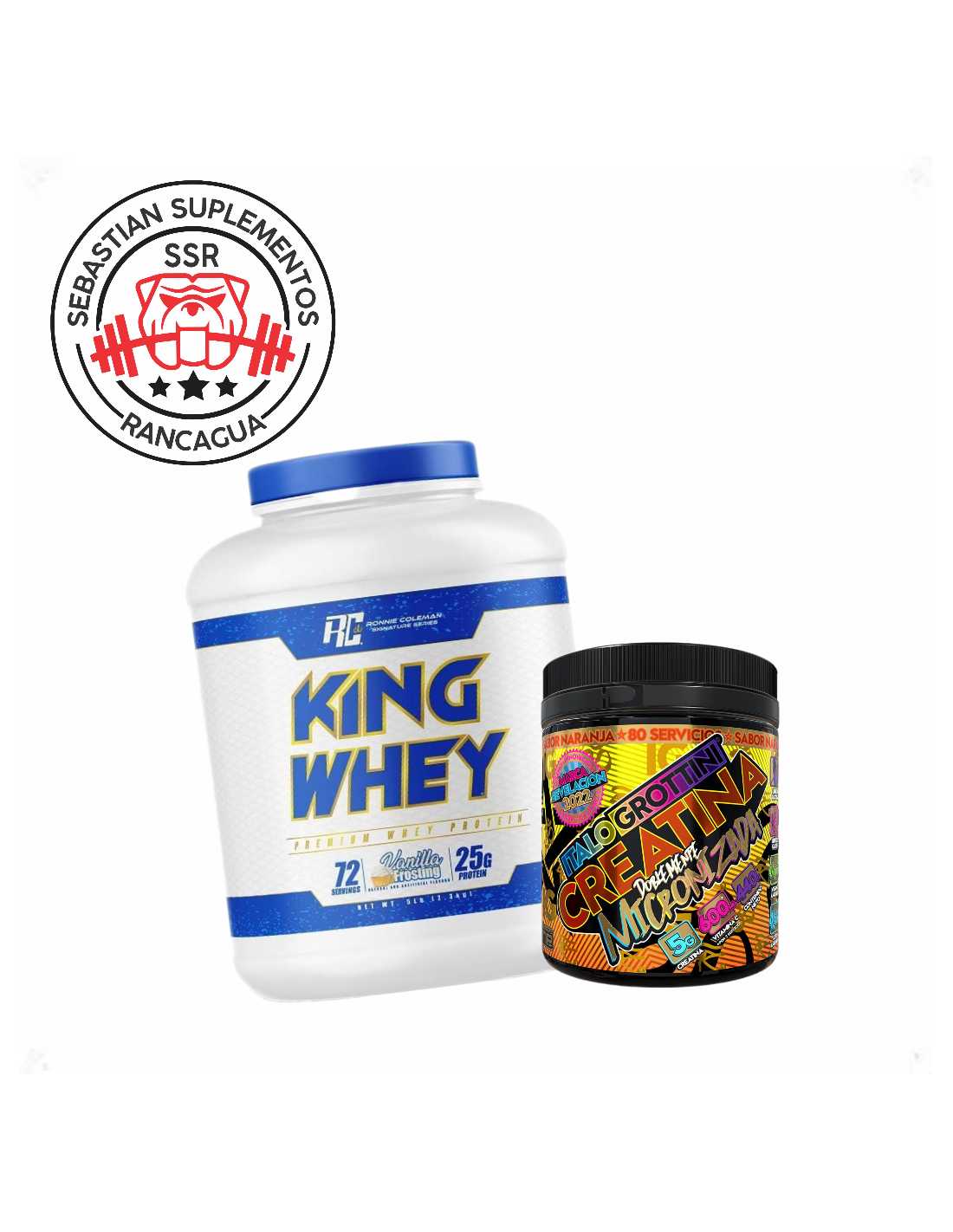 Pack King Whey 5lbs (Vainilla-Cookies-Chocolate Brownie-Dark Chocolate) + Creatina Grottini 400g (MangoMaracuya- Naranja)